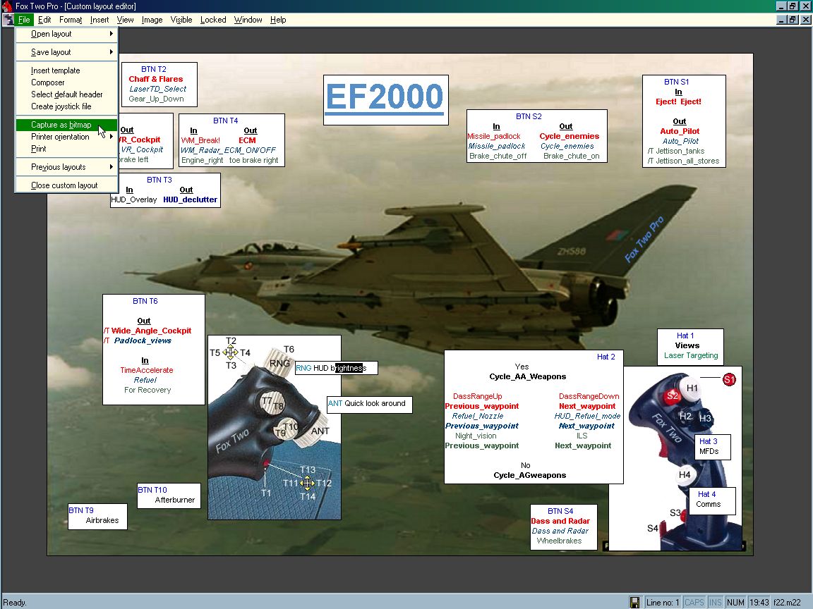 Introducing Fox Two ProfessionalWhy a professional version?The professional version came about for a whole host of reasons. Basically, I just didn't think that Fox Two would become so popular, and when it did, I found it somewhat overwhelming. I decided that I really ought to develop it further, incorporating the ideas that I'd received from Fox Two users, to create an "all singing, all dancing" version, that just did it all. Furthermore, I wanted to be able to distribute it on a CD, packed with a comprehensive collection of information, apps, files etc, so that on one CD, Thrustmaster users could have everything they ever needed. I got in touch with people at Thrustmaster, who very kindly offered to help out and allowed me to distribute their files, as well as involving the gurus of Thrustmaster, David "Mystic" Sandberg, Bill "Cowboy" Wilson, Buzz Hoffman and Bob Church. And what we produced is not just Fox Two Professional, but more than that, the Fox Two Pro CD, your ultimate Thrustmaster resource. Anyway, let's take a look at the elements that comprise this, and what the Professional version entails ....Editor