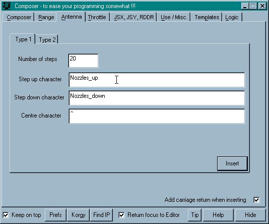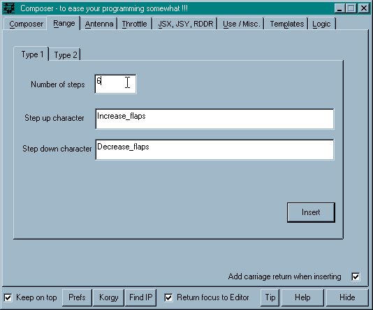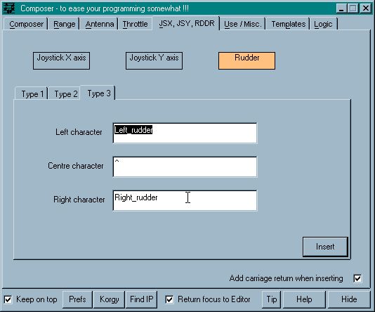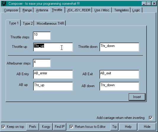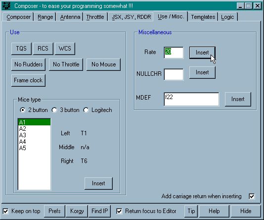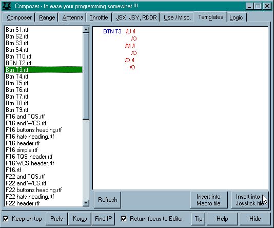 To facilitate your programming and to help you remember all the hats and buttons for your controllers, the Composer presents a graphical interface from which you can develop your files with. Note that Foxy still retains at its core its text based interface, but with the Composer, if you don't want to type into the main Editor, you don't have to. And for complete beginners, the Composer will take care of all the Thrustmaster syntax for you, inserting the correct statement lines into the editor in full colour as you just point and click. Simple. The Composer's main tab is backed up by other tabs that allow you to create with ease those statements for other aspects of your controllers, like the TQS range and antenna knobs, throttle, rudder and those miscellaneous statements you need. The templates tab allows you to insert preformatted text in your files increasing your development speed dramatically, and I can tell you that with templates and the macro list, you'll be banging out files at an incredible speed. Finally, logical programming is made a damn sight easier from the logic tab.