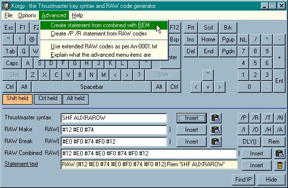 Korgy, is a graphical representation of your keyboard, which you use to generate the correct Thrustmaster syntax for any key. Just clicking on a key on Korgy not only provides you with the appropriate syntax for your controllers (the additional AUX key syntax used by F22 Pro owners is fully supported) but as well, the RAW Make, Break and Combined codes are correctly generated for any combination of keys selected.