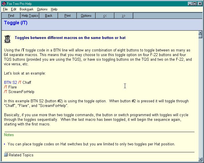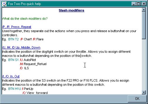 There is extensive help within Fox Two Pro, which means that you'll rarely need to go back to your manuals when you're stuck on a problem. This help not only covers the different features in Fox Two, all the various Thrustmaster syntax and statements, but also relevant help on hardware problems, such as how to disable a soundcard's gameport. Help is also easily at hand by highlighting whatever it is you want help on, eg. a menu item or selected text in your file, and then pressing F1 displays the relevant help topic. Further quick help is also available if you just want a quick reminder of how to use various Thrustmaster commands. With the Tip of the day window, the help file and the wizards, you'll be learning how to use Foxy and develop excellent files very very quickly and easily. And if you don't believe me, just scan through the comments page to see evidence that people are doing this already.